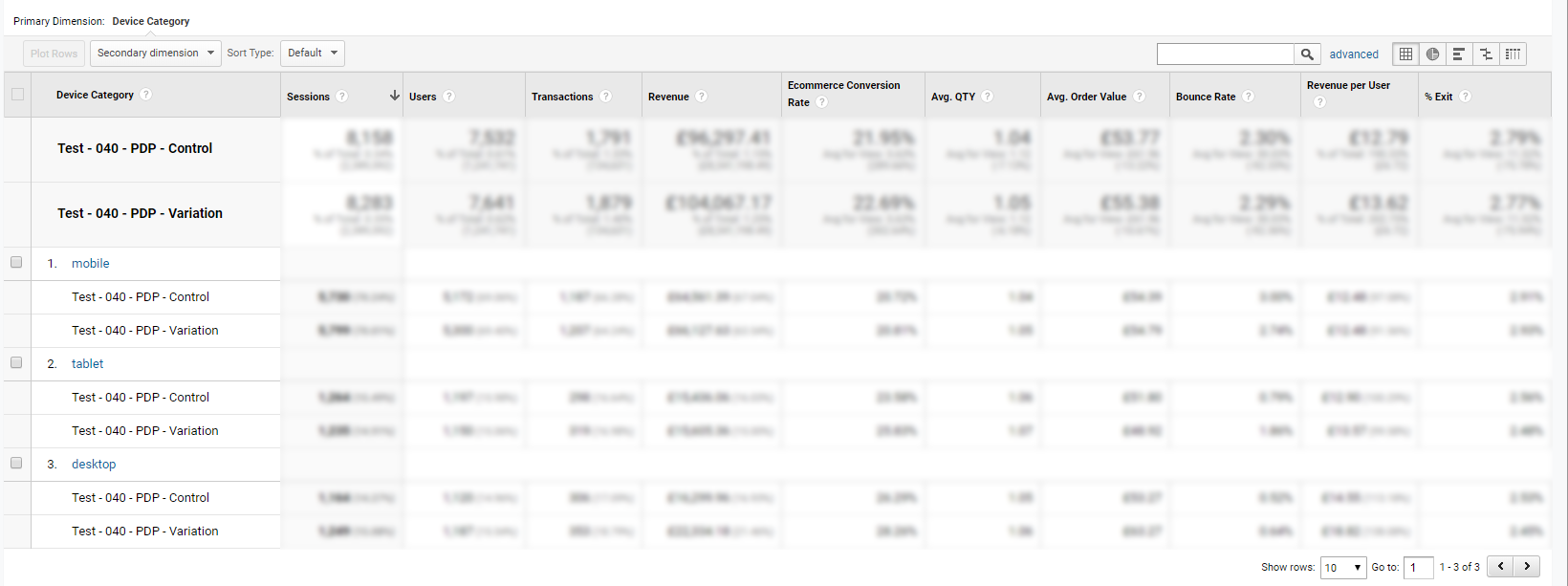Don’t get hyper-focused on one dimension – for example, whether the conversion rate uplifts differ from device to device. You can use secondary dimensions to see the differences for new/returning users, different traffic sources, or whatever additional data will help your test.